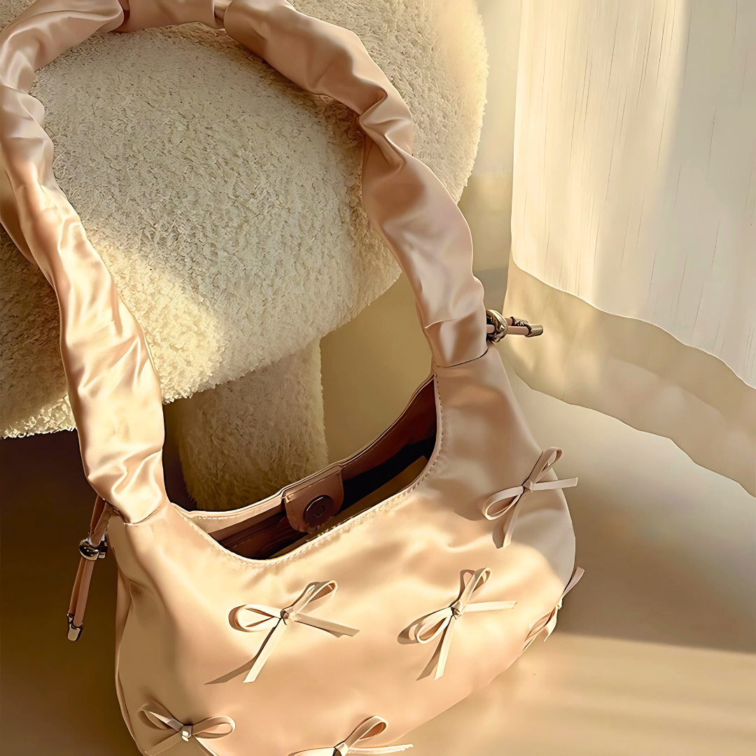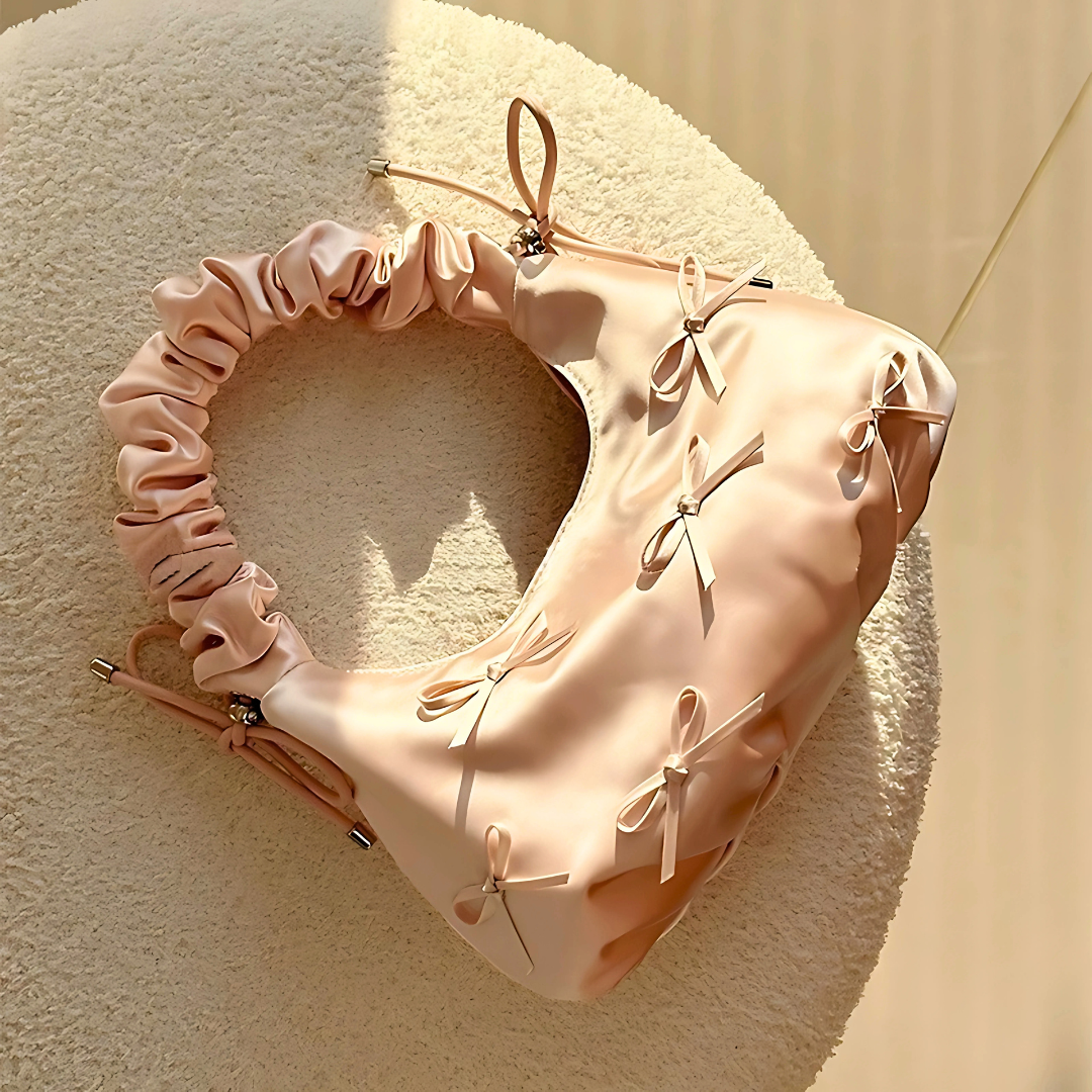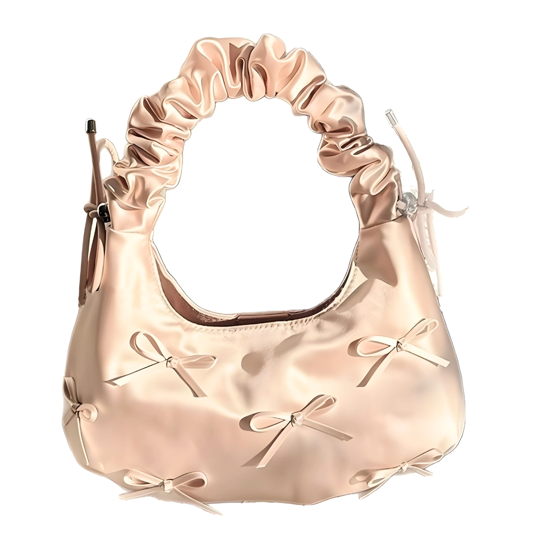 PuffBow, an Elegant satin shoulder bag in a soft pink hue, decorated with delicate bow accents. Featuring a ruched cloud-style handle and a smooth glossy finish, this bag adds a girly-chic touch to both everyday outfits and special occasions.