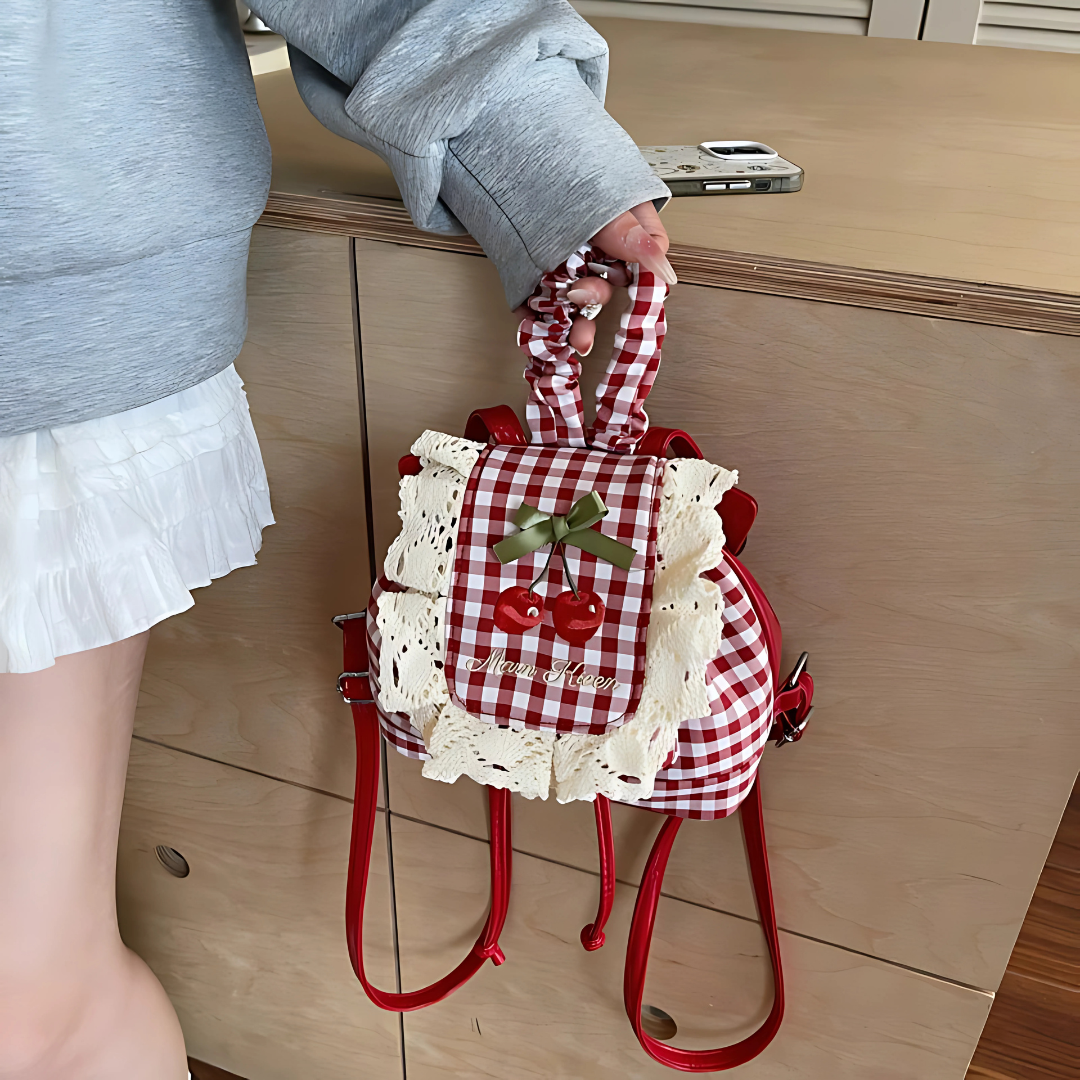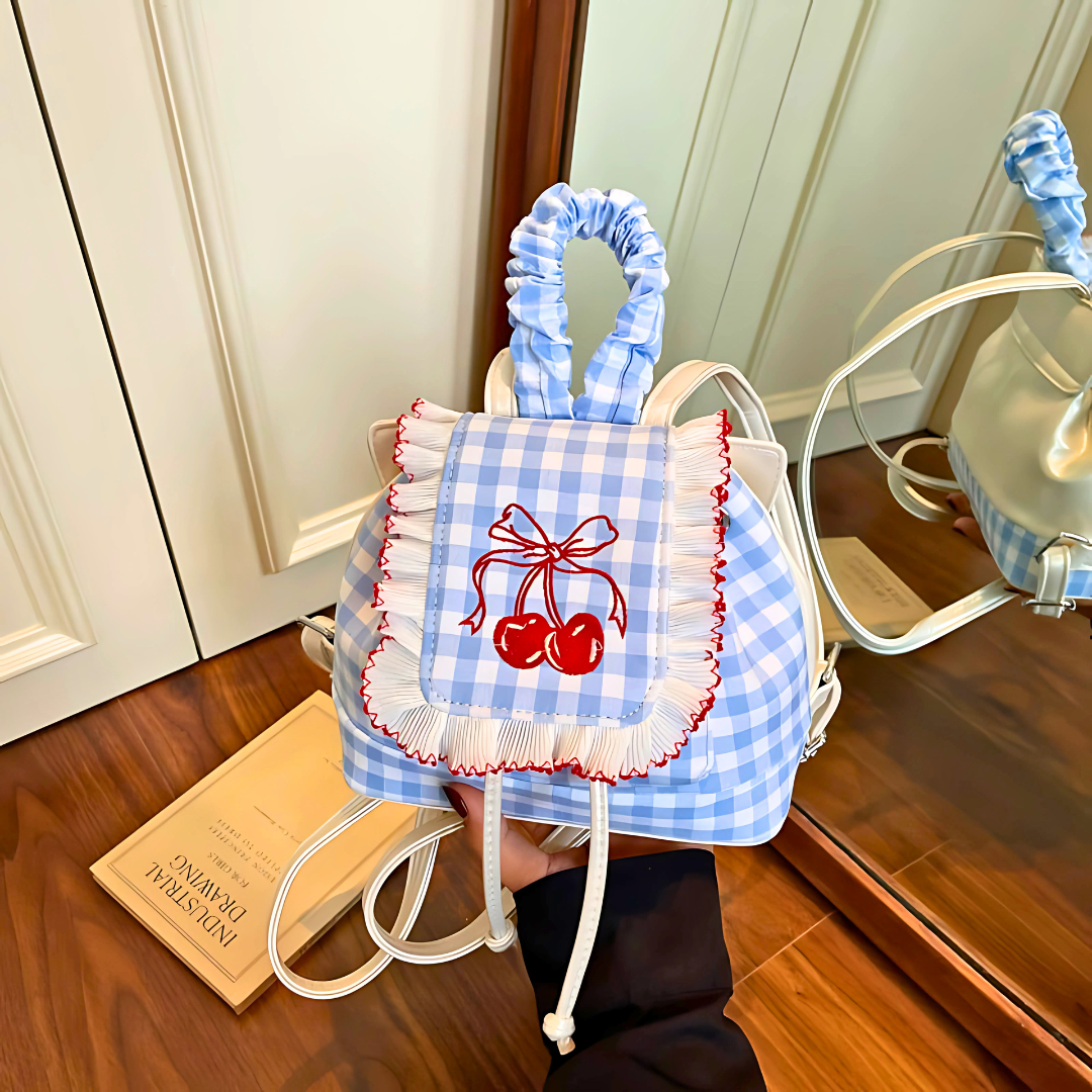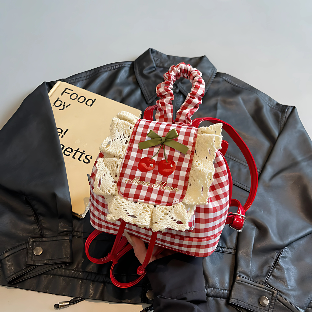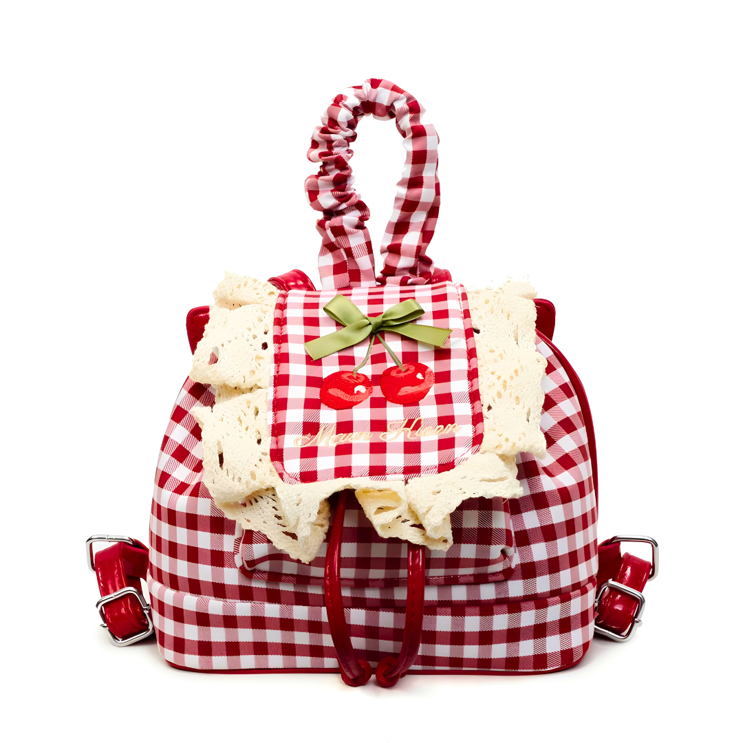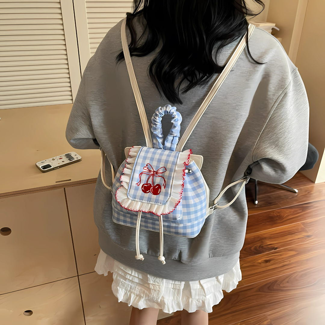 Add a touch of cottagecore sweetness to your look with the Cherringham Backpack. Featuring a charming red-and-white gingham plaid, soft lace ruffles, and a playful cherry embroidery topped with a satin bow, this mini backpack is the perfect mix of cute and girly. Available in sky blue and classic red, it’s ideal for school, café dates, or everyday outings. Lightweight yet roomy enough for your essentials, this bag is a must-have for lovers of kawaii and vintage-inspired fashion.