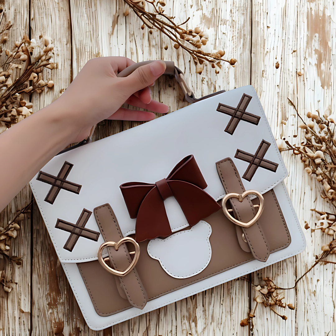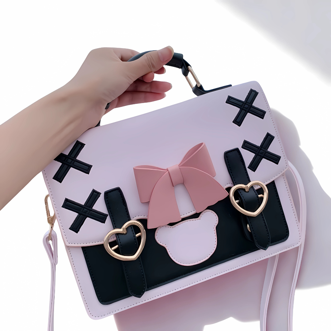 Bearie Satchel A chic fusion of kawaii and elegance. This pastel pink and black handbag features heart-shaped buckles, playful bow detailing, and a subtle bear silhouette for a cute yet fashionable look. With its spacious interior, it’s perfect for commuting, shopping, or styling your daily outfits. Can be worn as a handbag, shoulder bag, or crossbody for ultimate versatility.