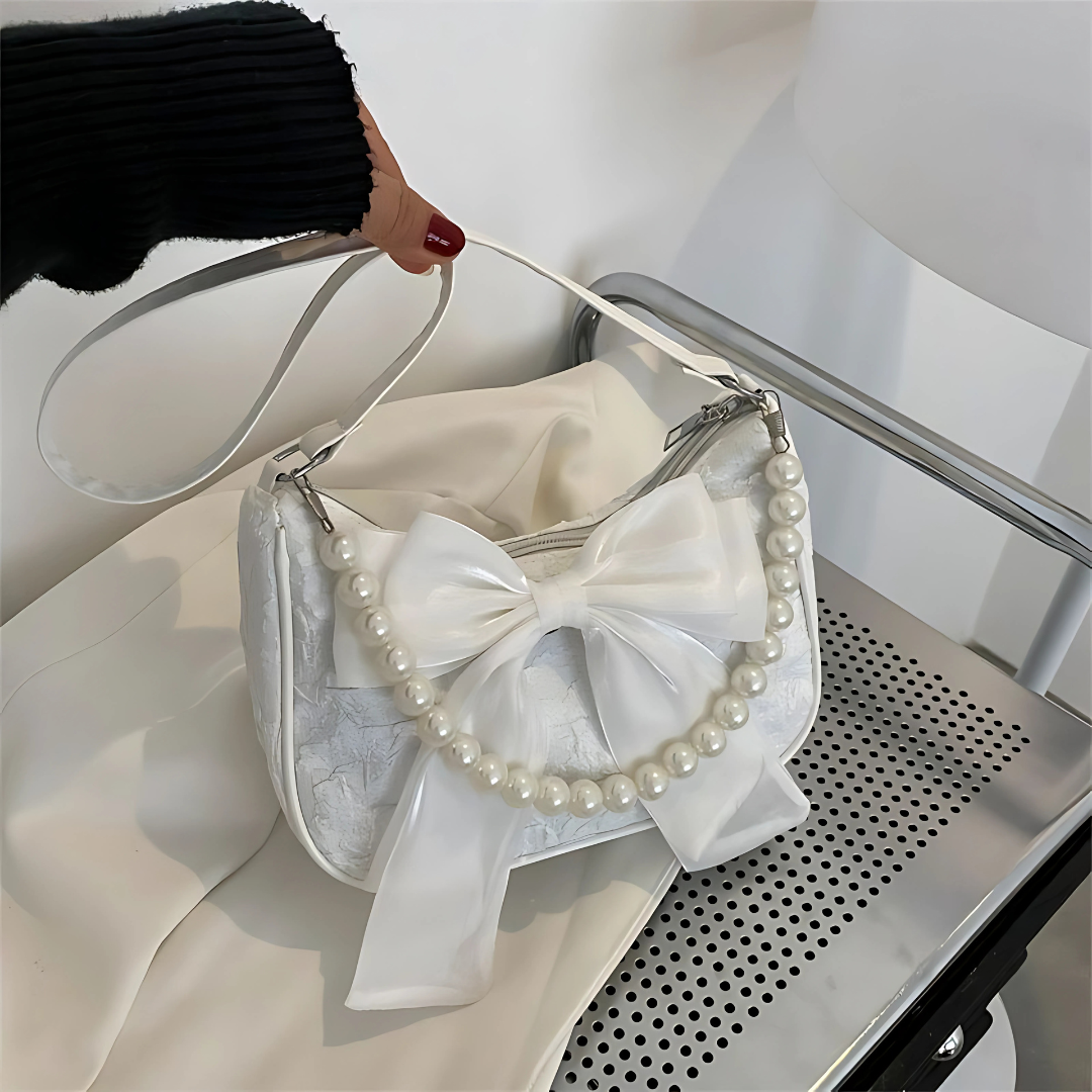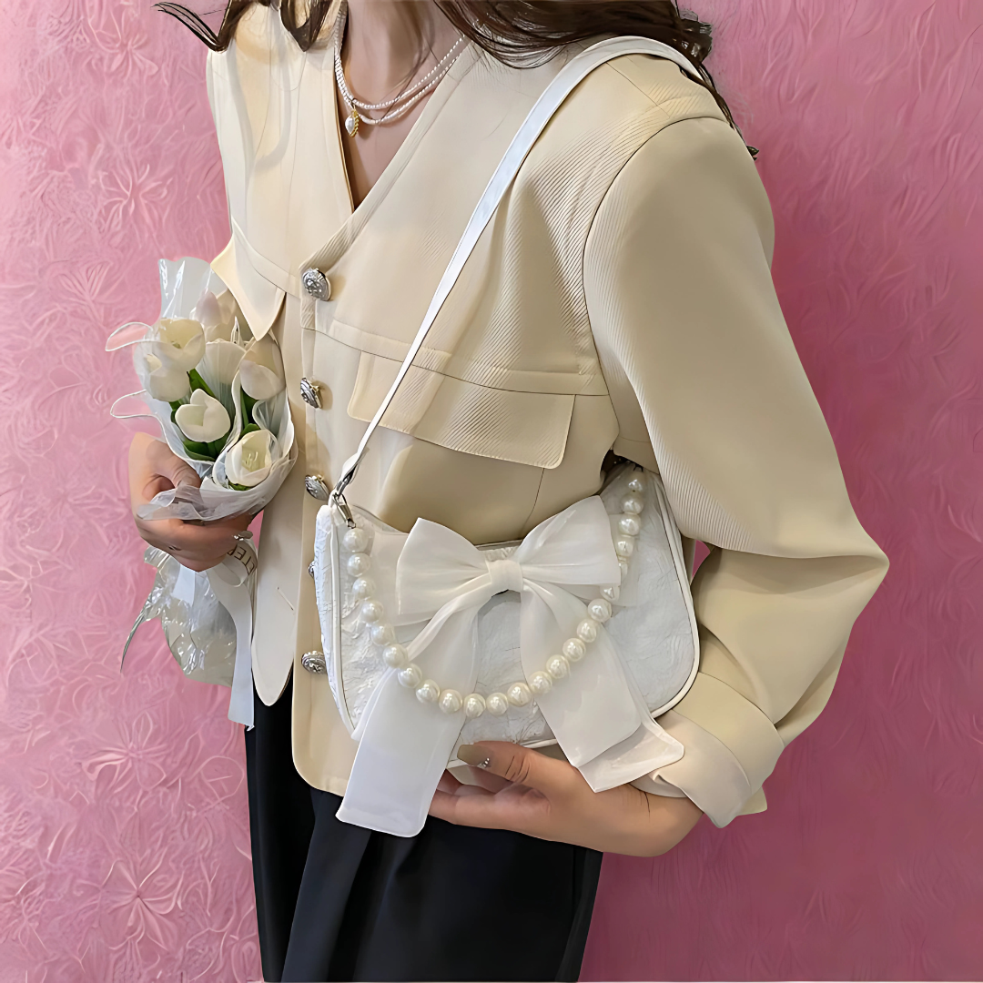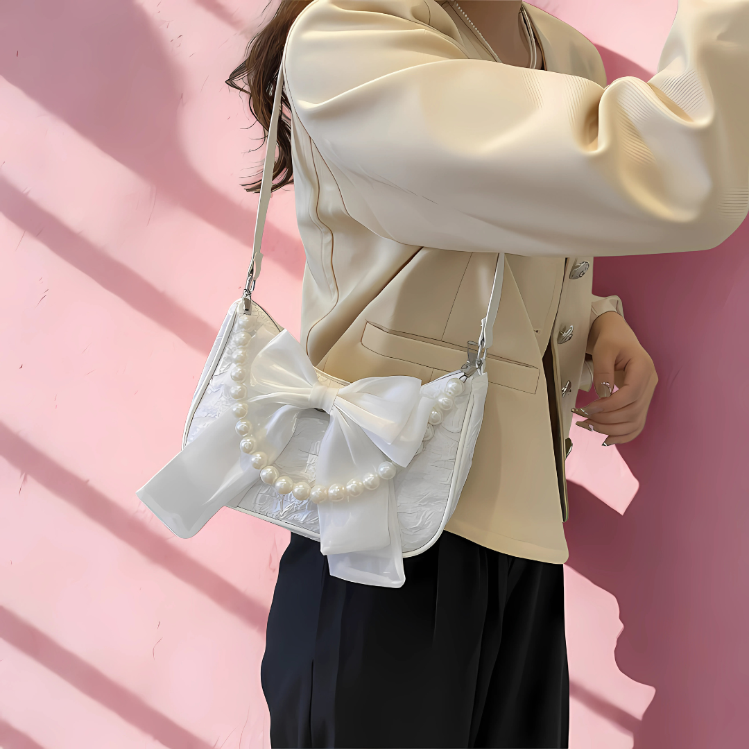 Add a touch of elegance and cuteness to your outfits with this adorable handbag! Decorated with a big ribbon bow and a pearl handle, it’s the perfect mix of classy and kawaii. 💕