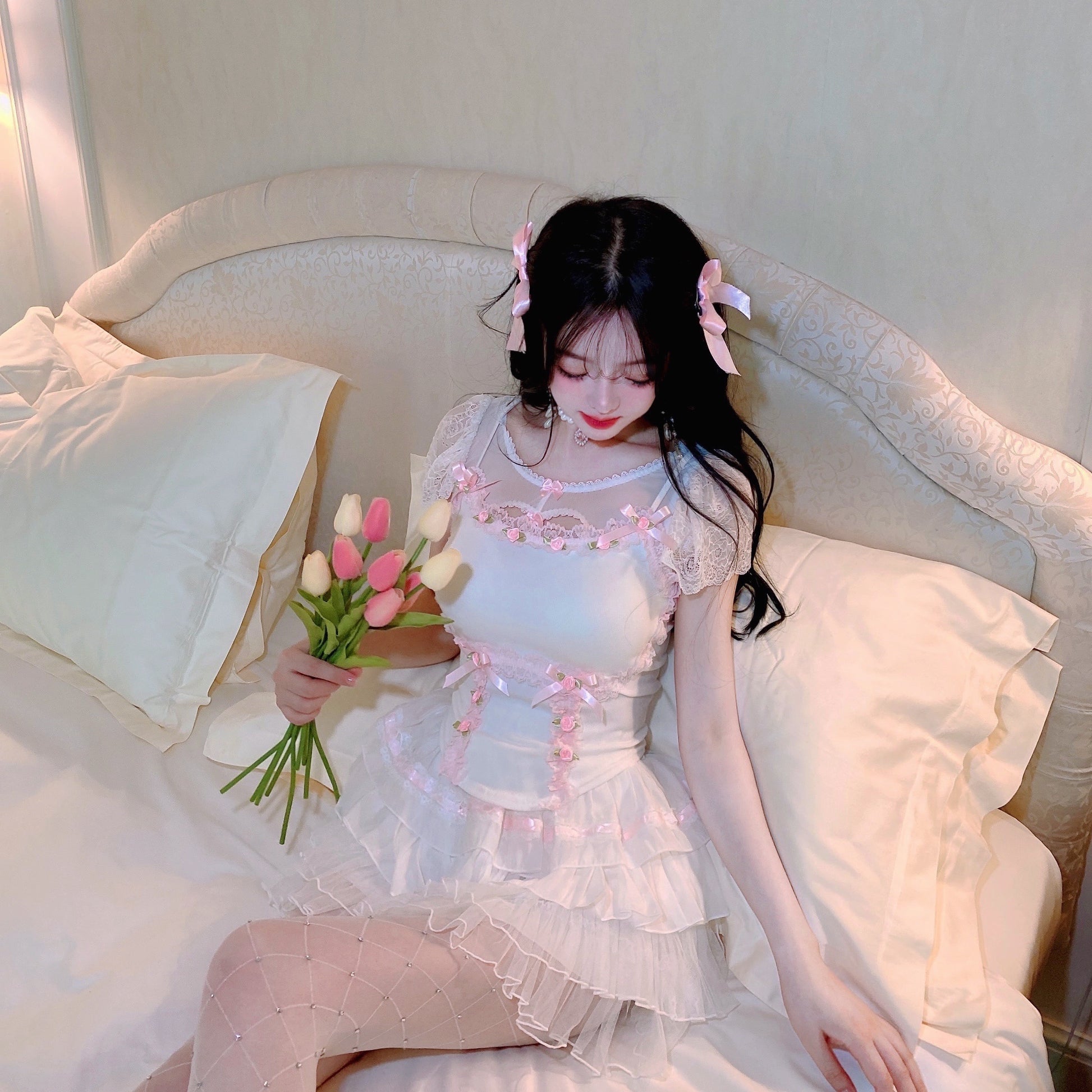 Features: bow gauze lace