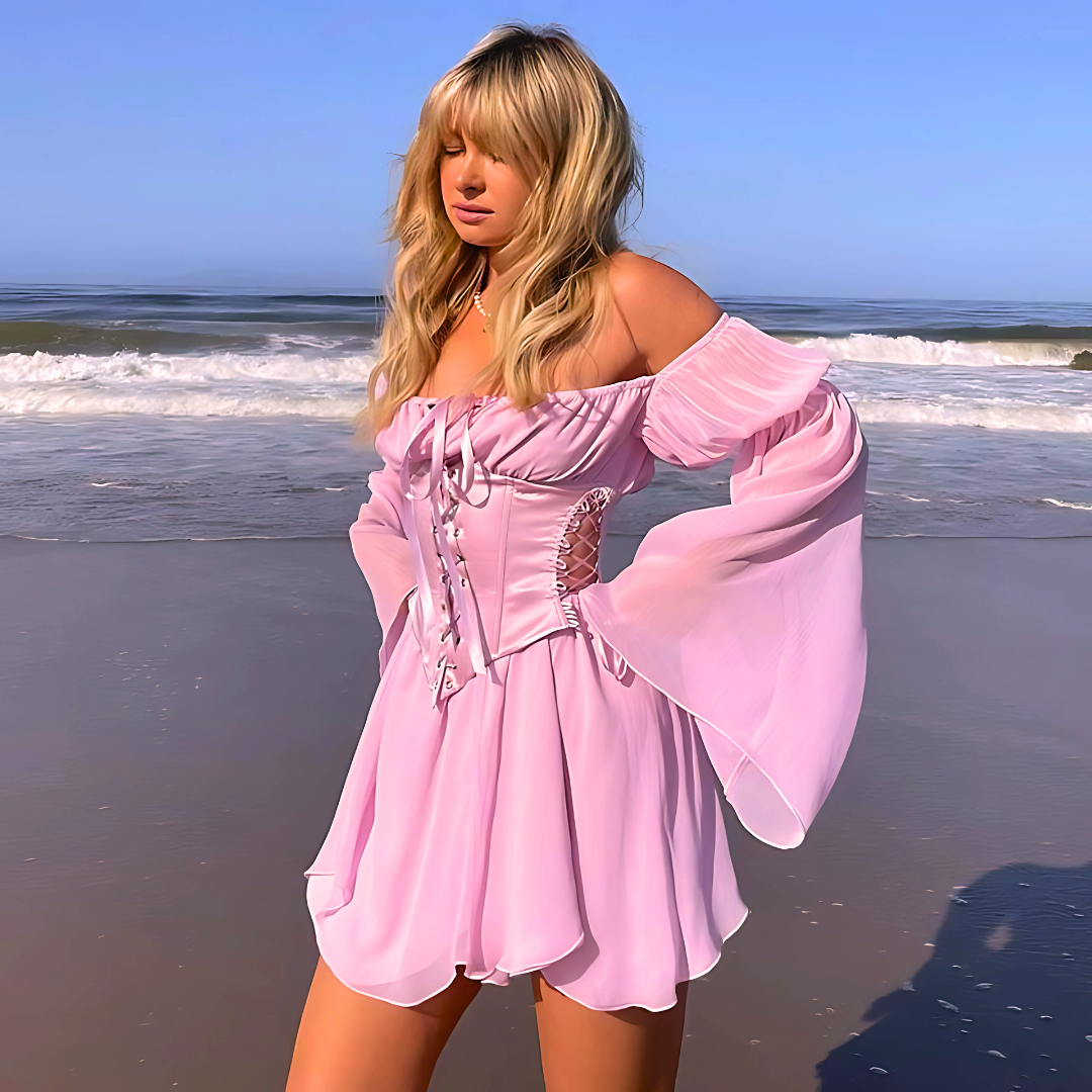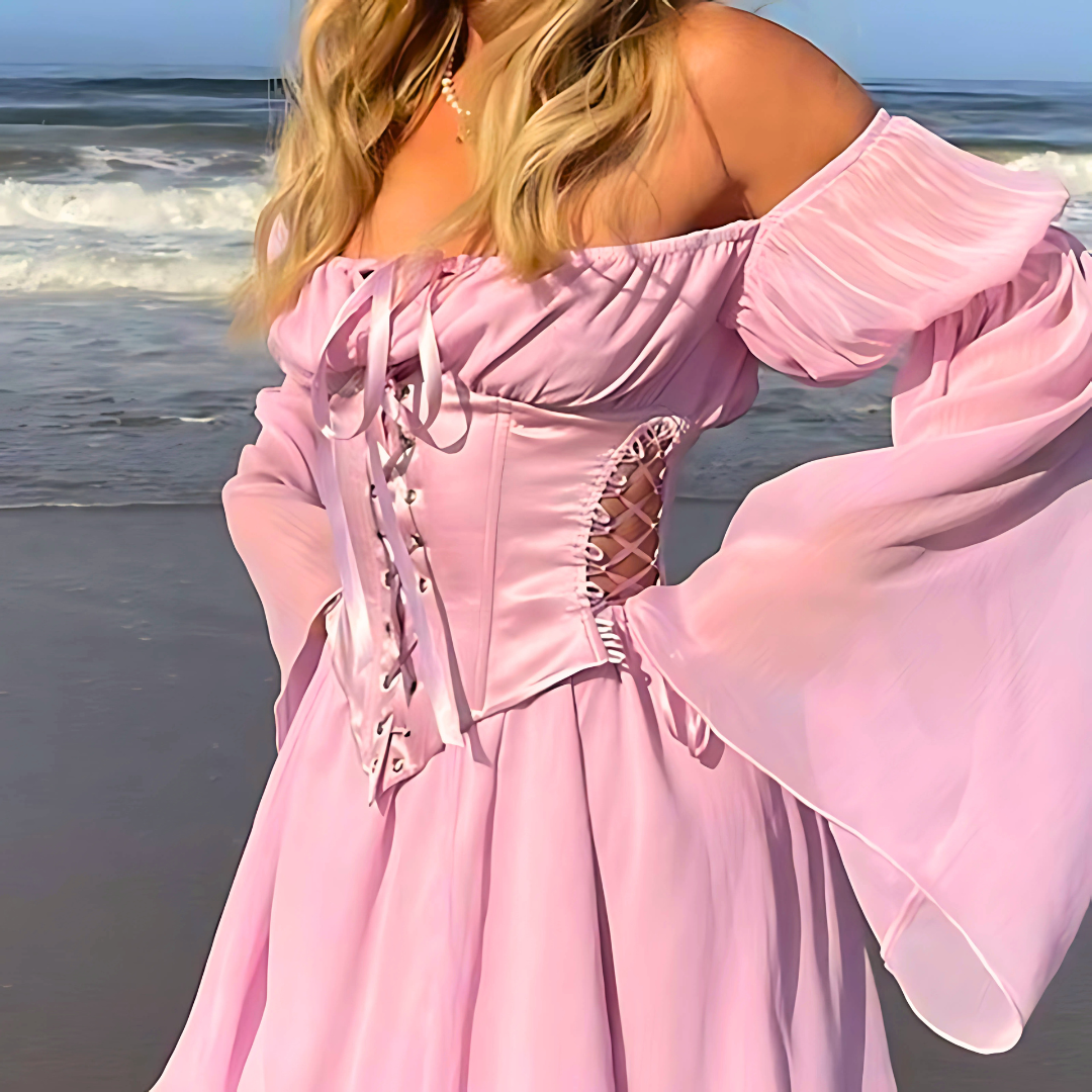 Embrace the magic of timeless elegance with our "FairyBloom" dress. Designed with dreamy off-shoulder sleeves and a lace-up corset waist, this piece combines romance and sophistication in the most flattering way. The flowing bell sleeves and airy skirt dance with every step, giving you that effortless fairytale charm.