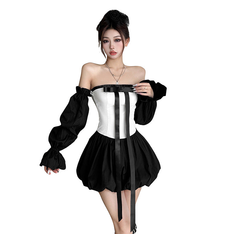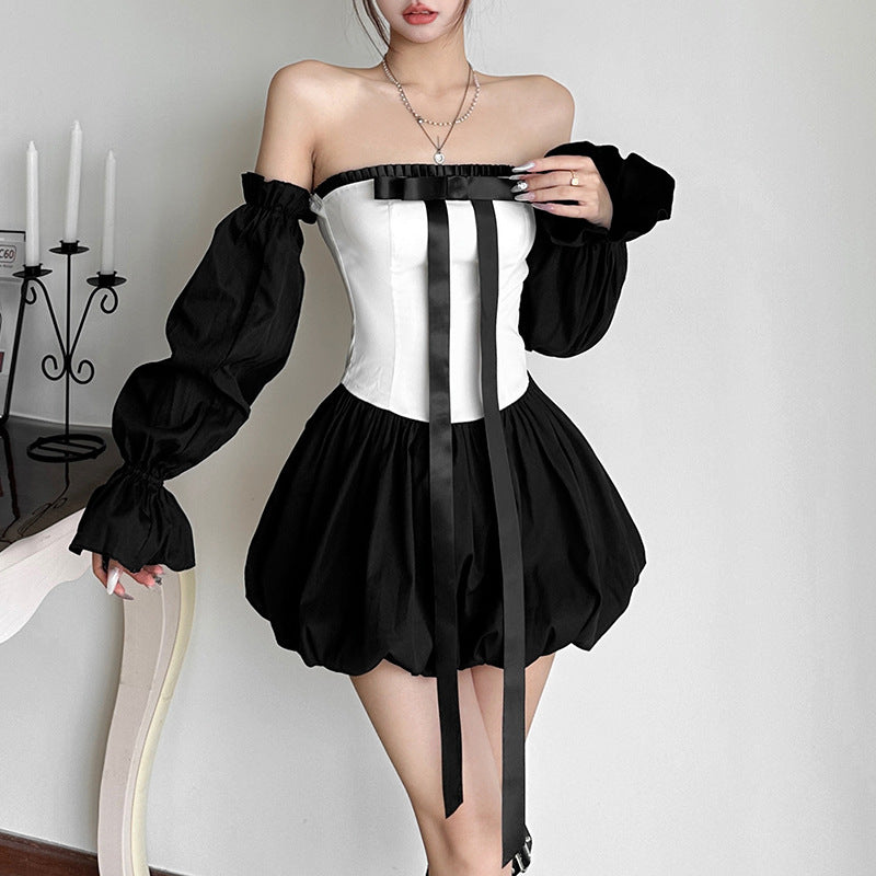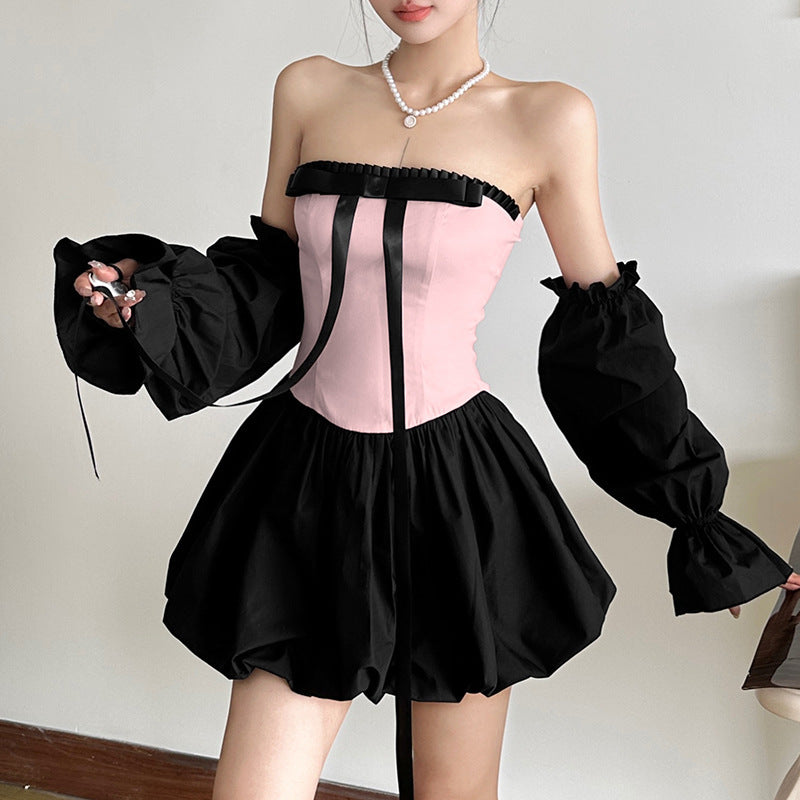 Contrast Color Fashion Hot Girl Bow Tube Top Cinched Waist Bud Skirt Dress