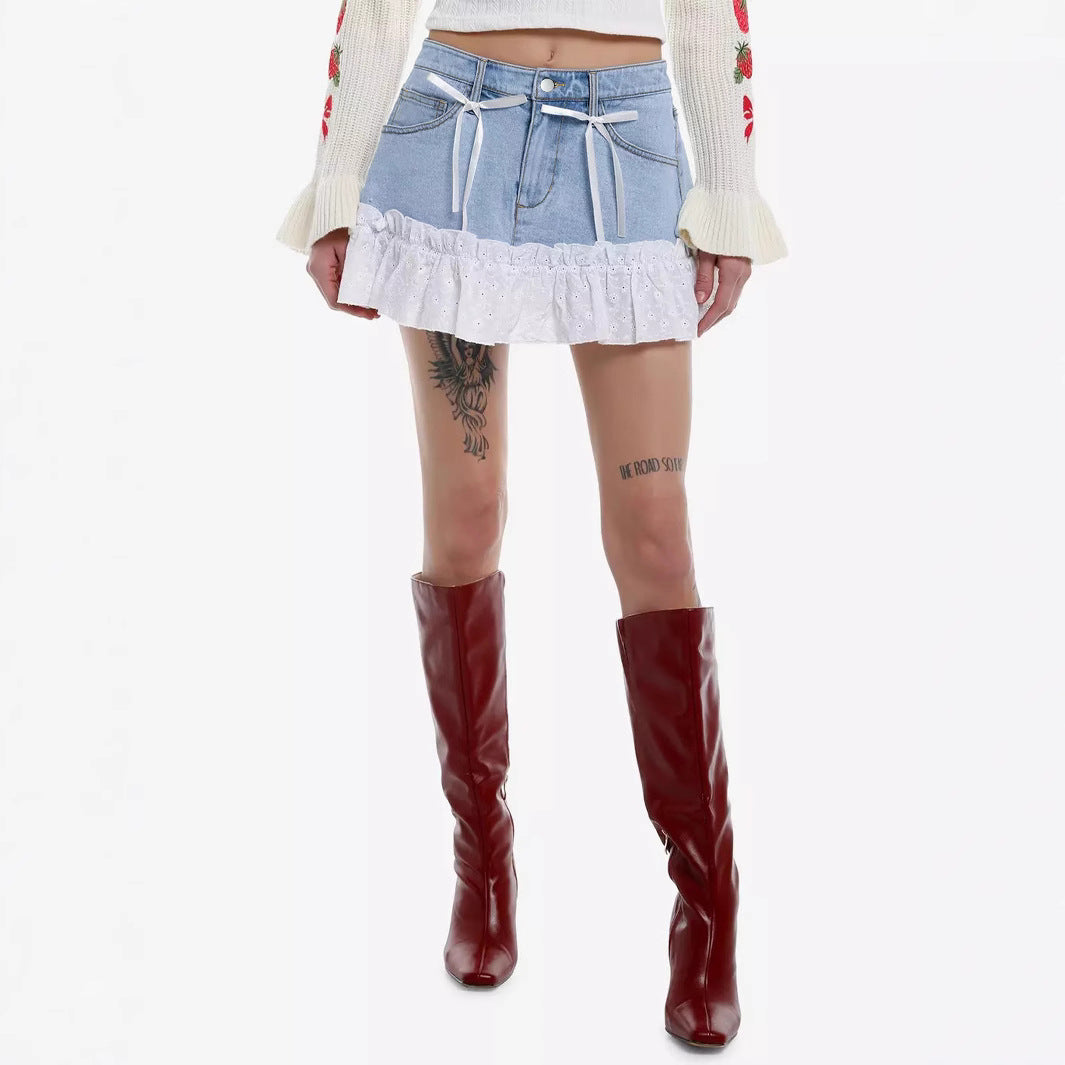 Cross-Border European And American Bow Lace Denim Skirt Sweet Splicing Skirt Xiyin Ozon Walmart Tk Spot