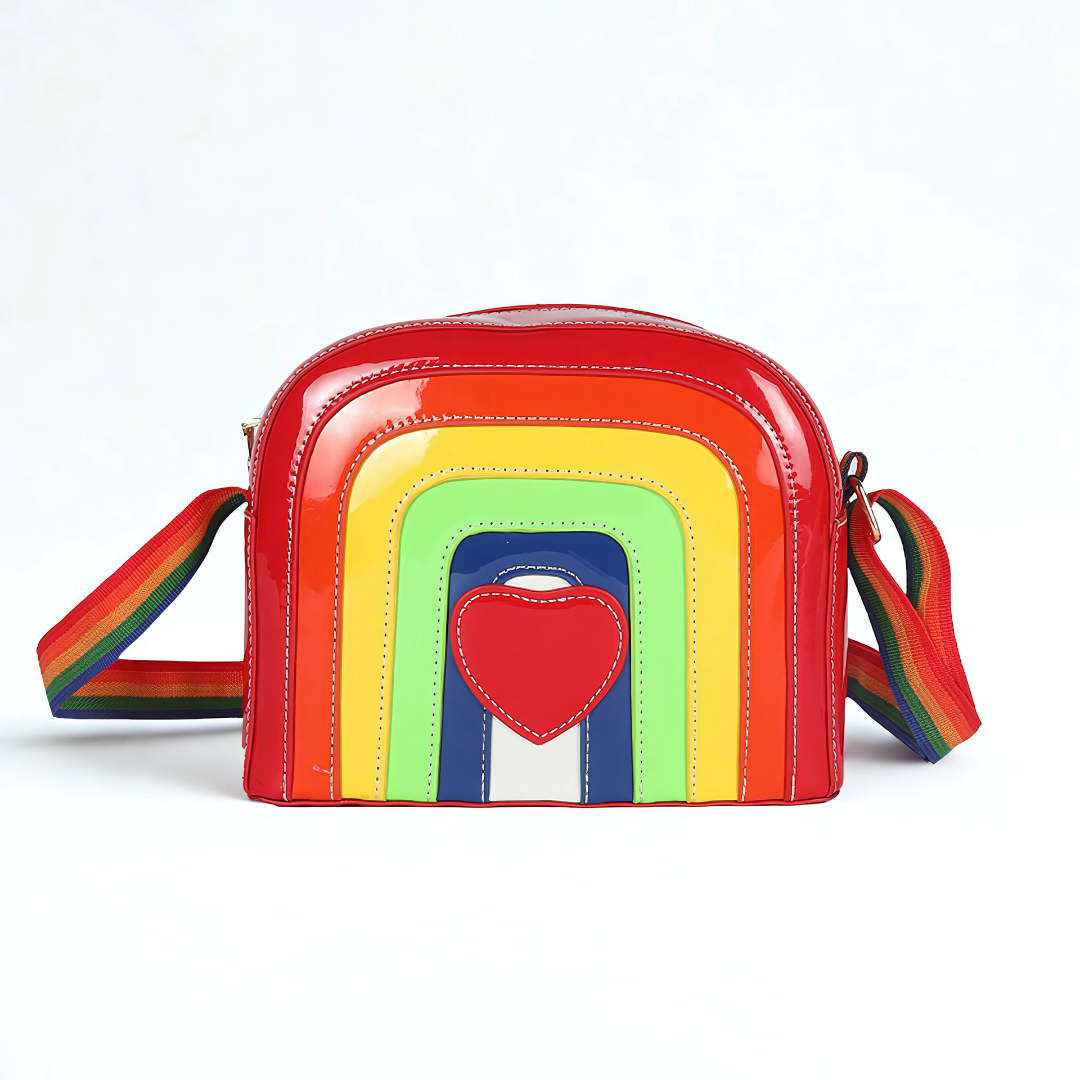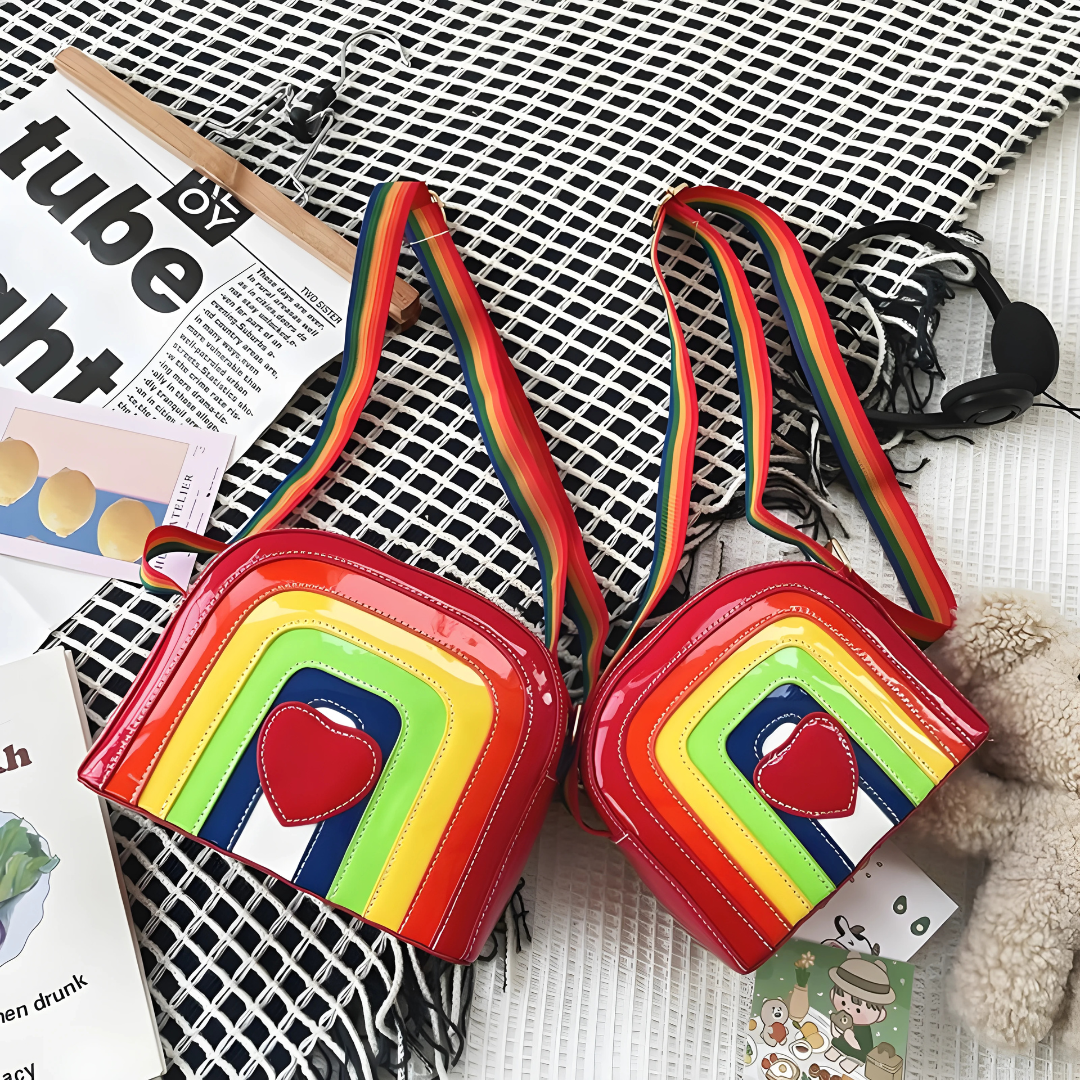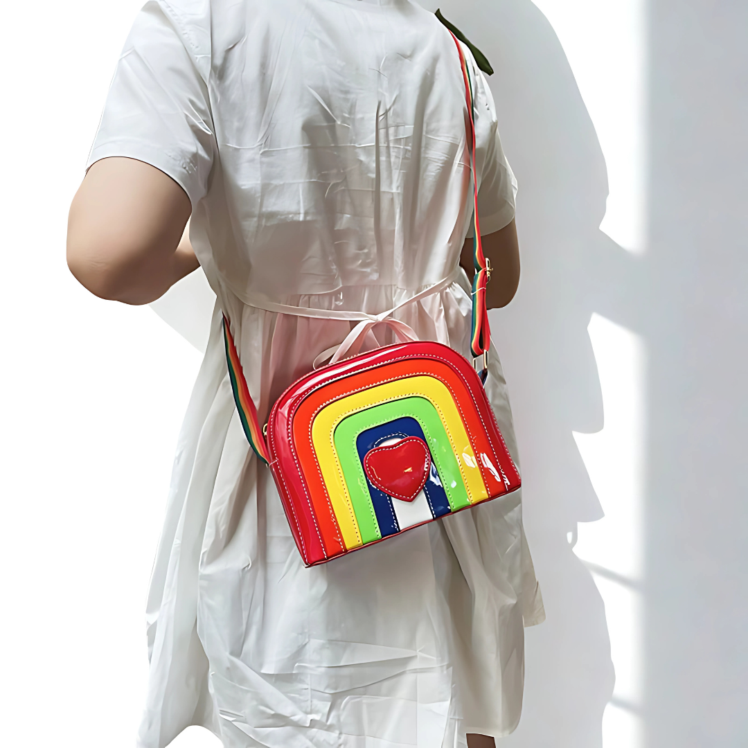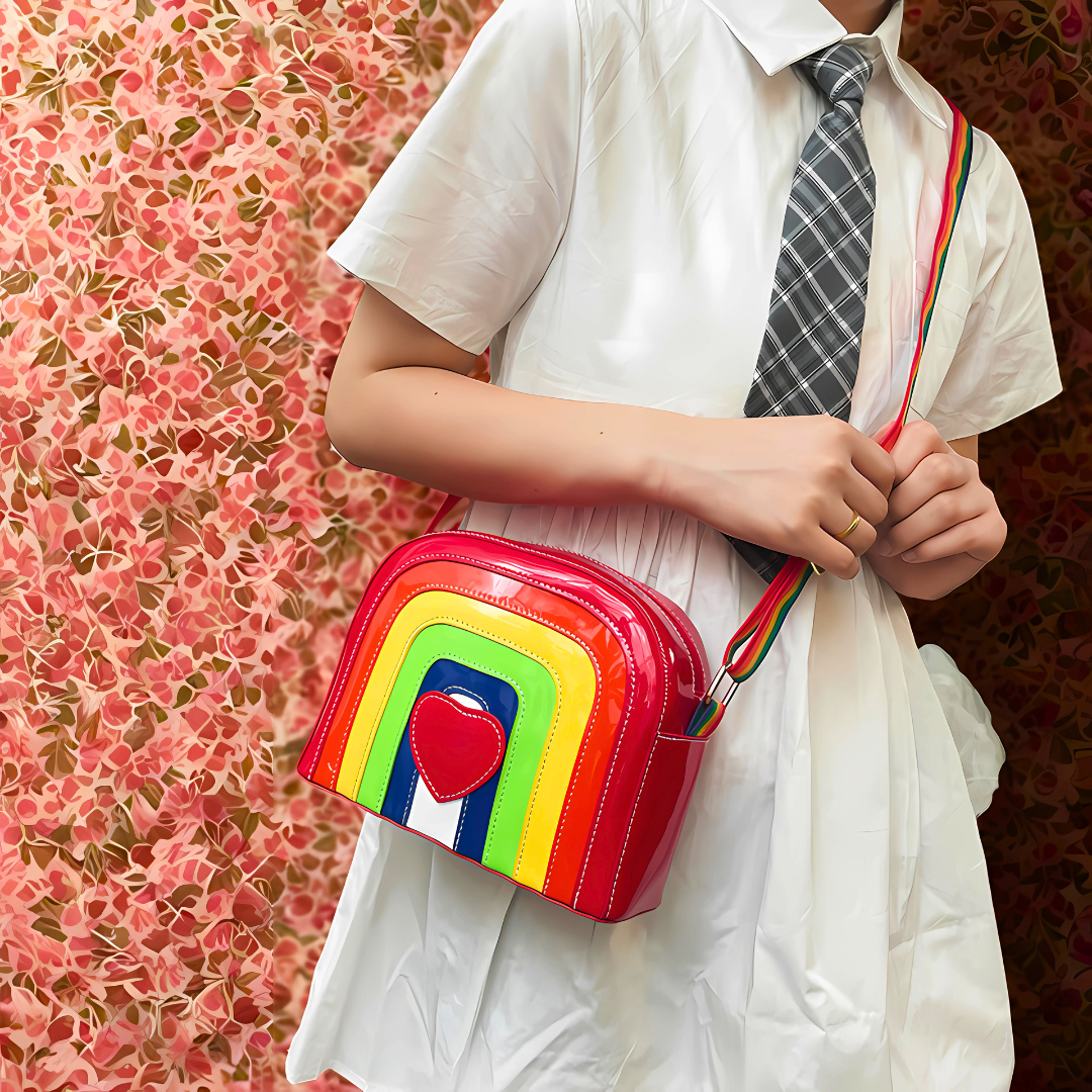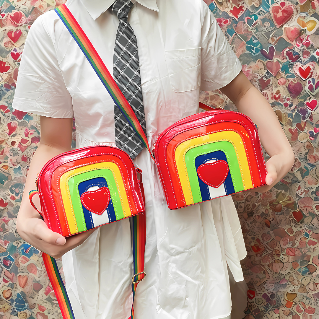 Brighten up your look with the NijiHeart Bag! With its multicolored rainbow design and a sweet heart at the center, this bag radiates happiness and playful vibes. Lightweight and practical, it comes with a matching rainbow strap, making it perfect for everyday wear or fun outings with friends.