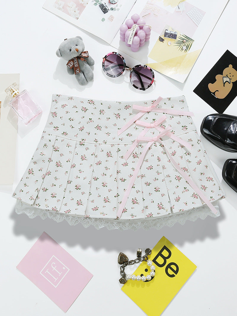 Pure Desire Style Little Man Floral Skirt Sweet Girl Lace-up Bow Short Skirt Anti-glare Pleated Overskirt 9372